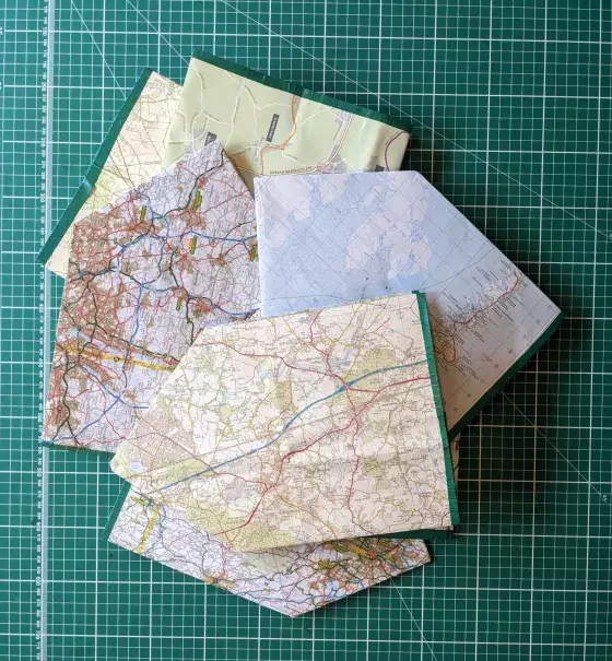I had already been thinking about locations that are meaningful to me and had been collecting old maps to represent these. Finding the maps second hand was important to me for my intention to ‘Use salvaged, discarded and second hand materials‘ rather than buying new. I also prefer the aesthetic of used – the odd smudge, crease or sign of use adding an extra layer of history to the work.