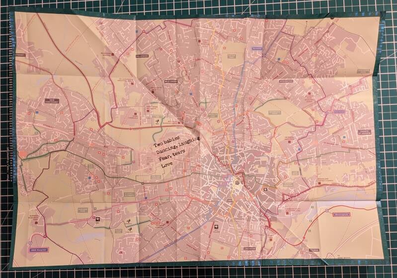 Once I had my 7 folded pieces I put them into order (roughly chronological) and glued them together. I kept checking that they were standing up as I went along but still couldn’t be 100% sure it would work once they were all together but, phew it did! Next, to mark the meaningful locations more accurately. I chose to write a very short piece around memory for each place using the project constraint of seven words. After a bit of thought I stumbled across a method of getting the text onto the maps (I have since used this over and over again). I typed the text I wanted into a Word document, stuck a piece of masking tape to my laptop screen and traced over it*. The tape could then be stuck to the appropriate place on the map marking the location whilst allowing the map underneath to still show through.