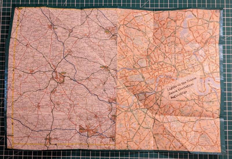 I carried out some experimentation before making the book as I wanted to scale up from the small pages I had made previously and be able to join seven of them together. I worked out that each sheet would need to be fairly thick if I wanted the folds to stay in place when I opened the whole thing out to form the sculptural element. With a selection of different types of map some of them were thinner than others and to further complicate things I also wanted them to all be double sided. I set about preparing my 7 pages to ensure they met my requirements. I used the same tape I have used elsewhere in the project to bind the pages. I am enjoying finding ways I can link the different pieces of work together through small elements like this. I find something about this image very pleasing!