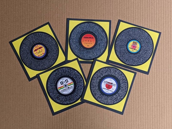 Pack of 5 square art cards featuring five of my Scribbled Sounds prints - Songs of Love, A Day in the Life, 80s, Ska and Northern Soul.