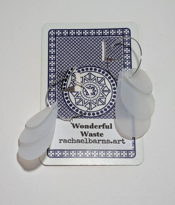 Beautiful triple teardrop shapes on delicate silver hoop earrings. Made from waste plastic drinks' bottles and presented on used playing cards.