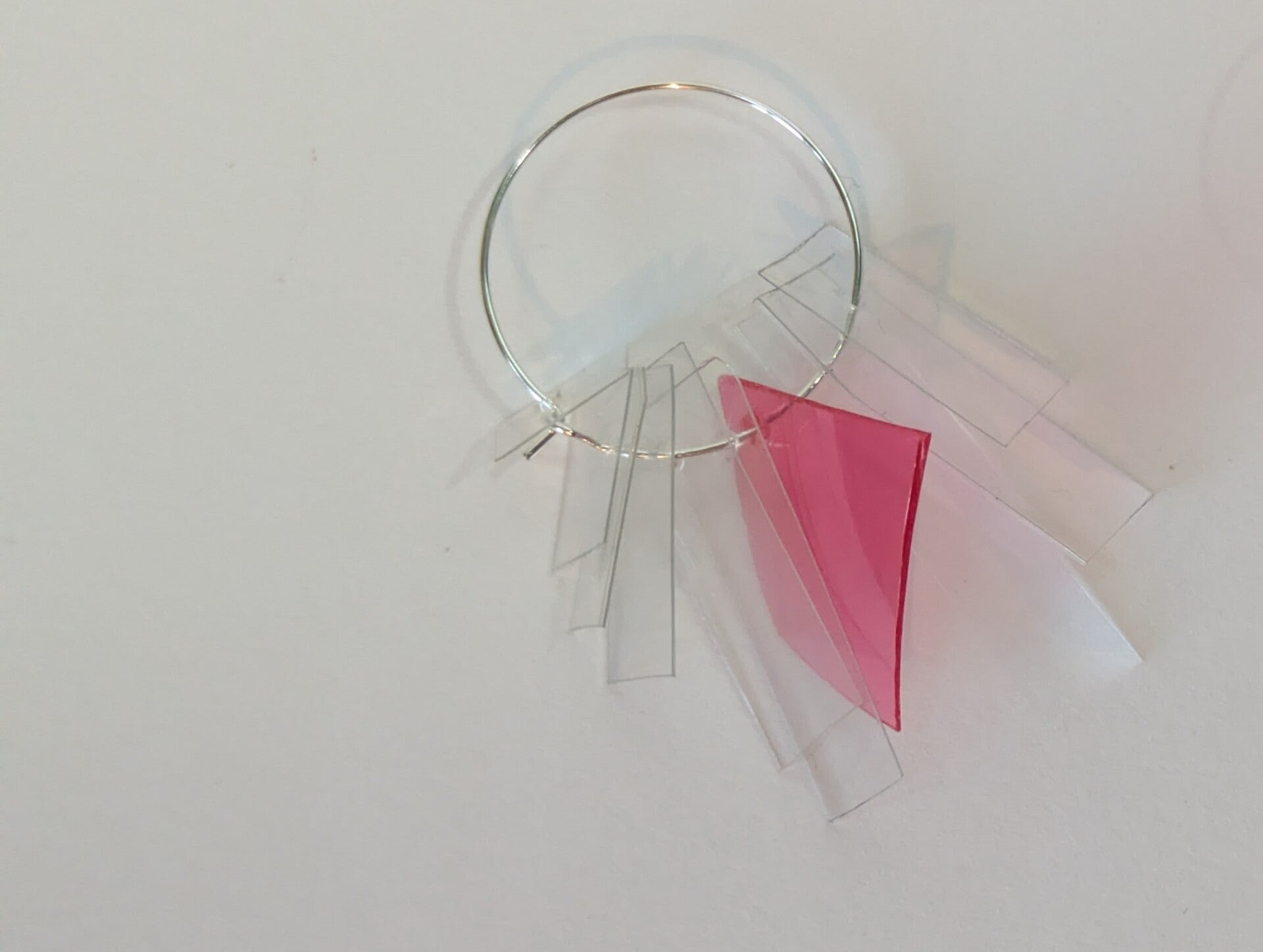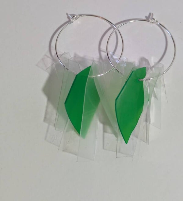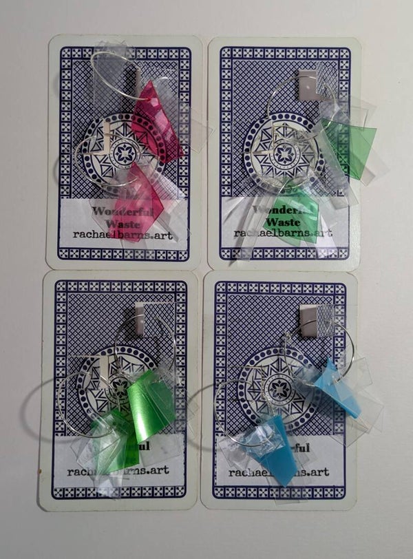 Delicate silver hoop earrings with shards cut from waste food and drinks' packaging. Presented on used playing cards.
