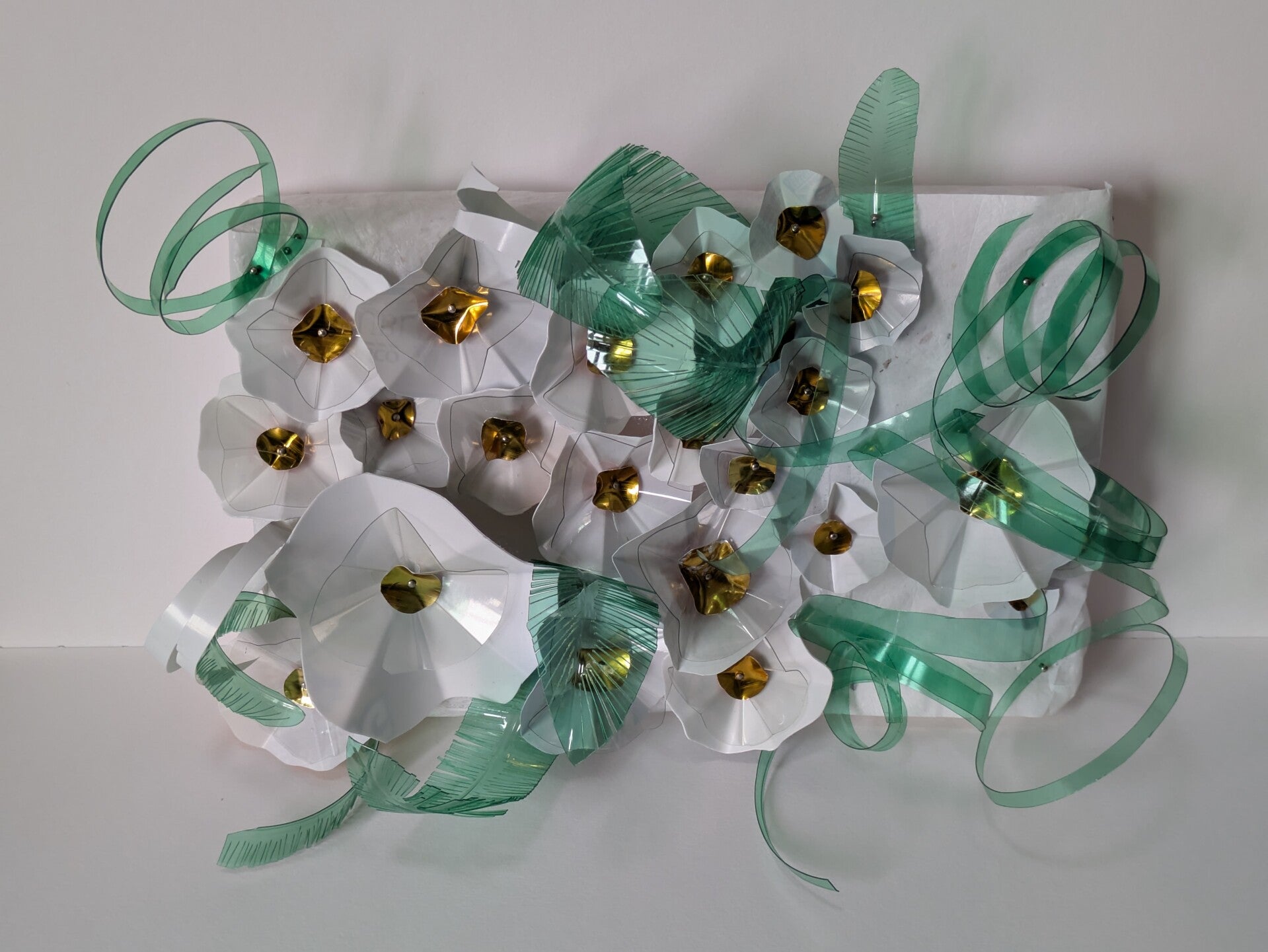 This unique piece has been created entirely from waste food and drinks packaging. Made from yogurt and cream cartons, water bottles and a tomato puree tube all pinned to a block of polystyrene packaging which is covered in fused plastic sheets made from carrier bags. Even the pins were unwanted (donated to me as too short for a seamstress friend).