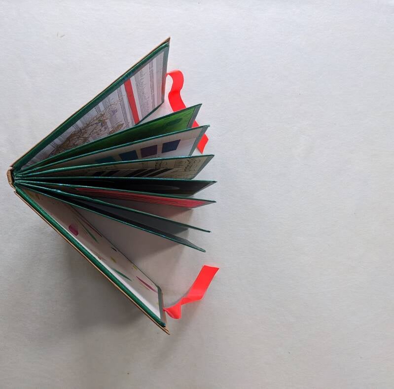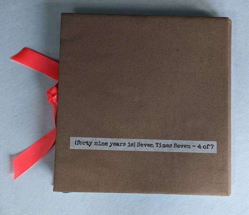 Seven collaged pages with information about the number seven. Each piece of information written in seven words. Brought together in the form of a covered board book.