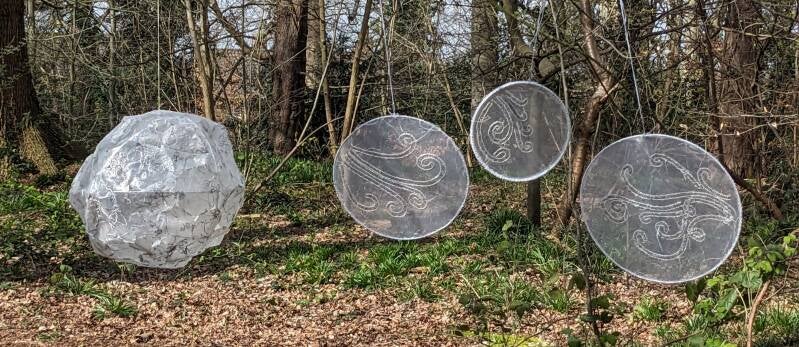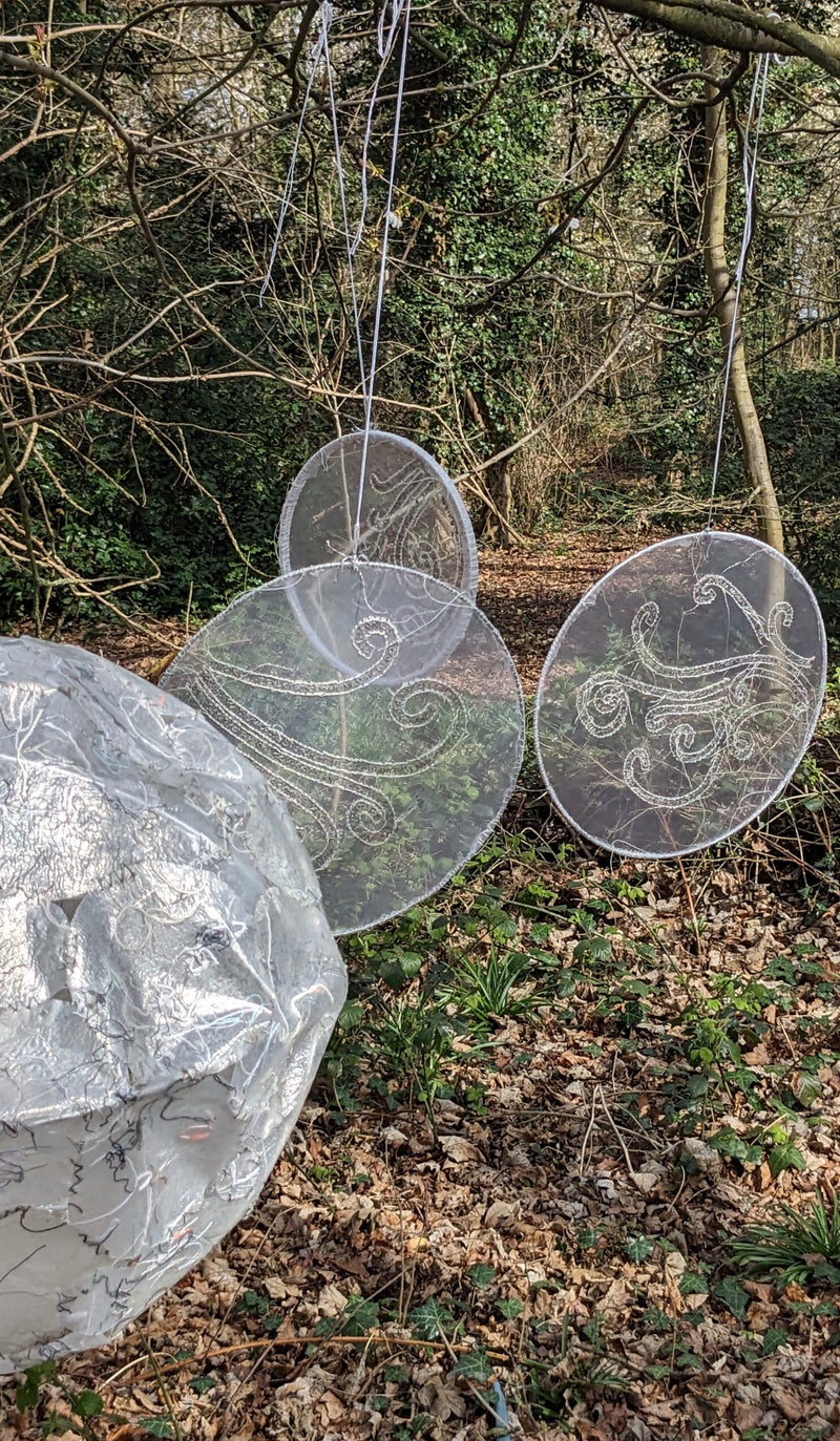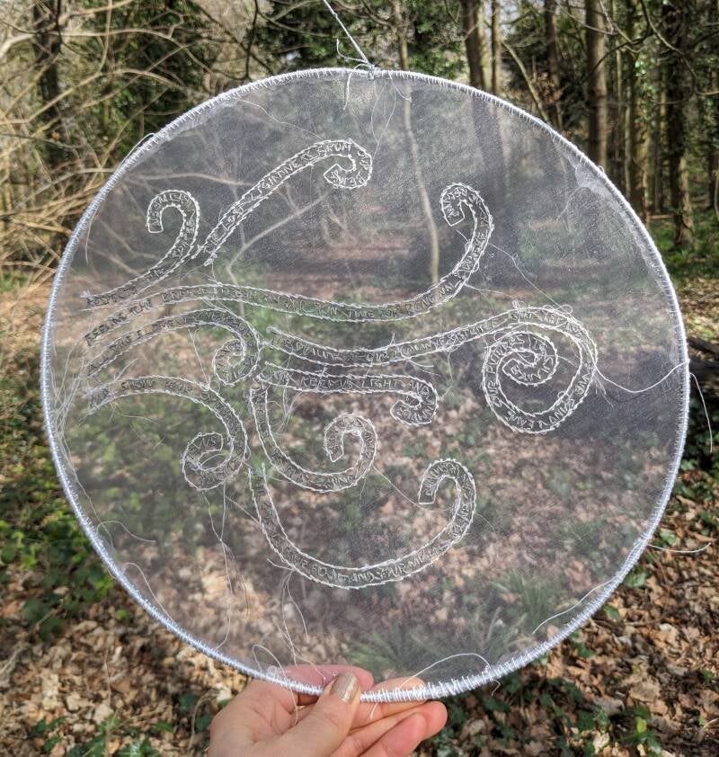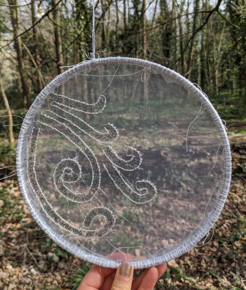Collaborative sculptural texts created as part of my Four Elements project. Each of the contributed texts has been embroidered onto sheer packaging fabric. Made to be light and to hang from the trees allowing the air to move them and become part of the artwork.
