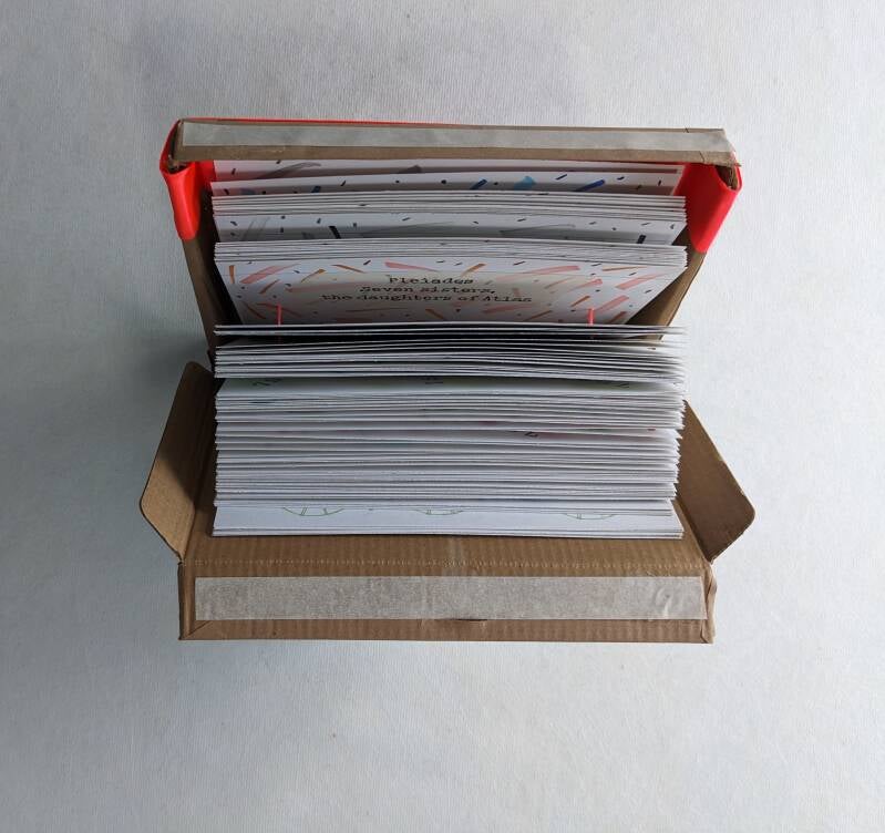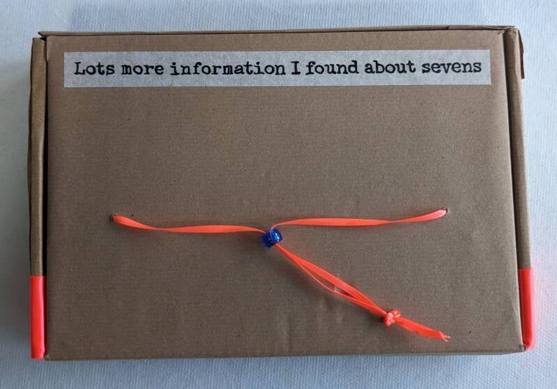 Information about the number seven in religion, folklore and classical antiquity. Forty-nine 'facts' written in seven words each along with forty-nine representations of the number seven in multiple languages and numerical symbols. Brought together in the form of a palm books inspired artists' book.